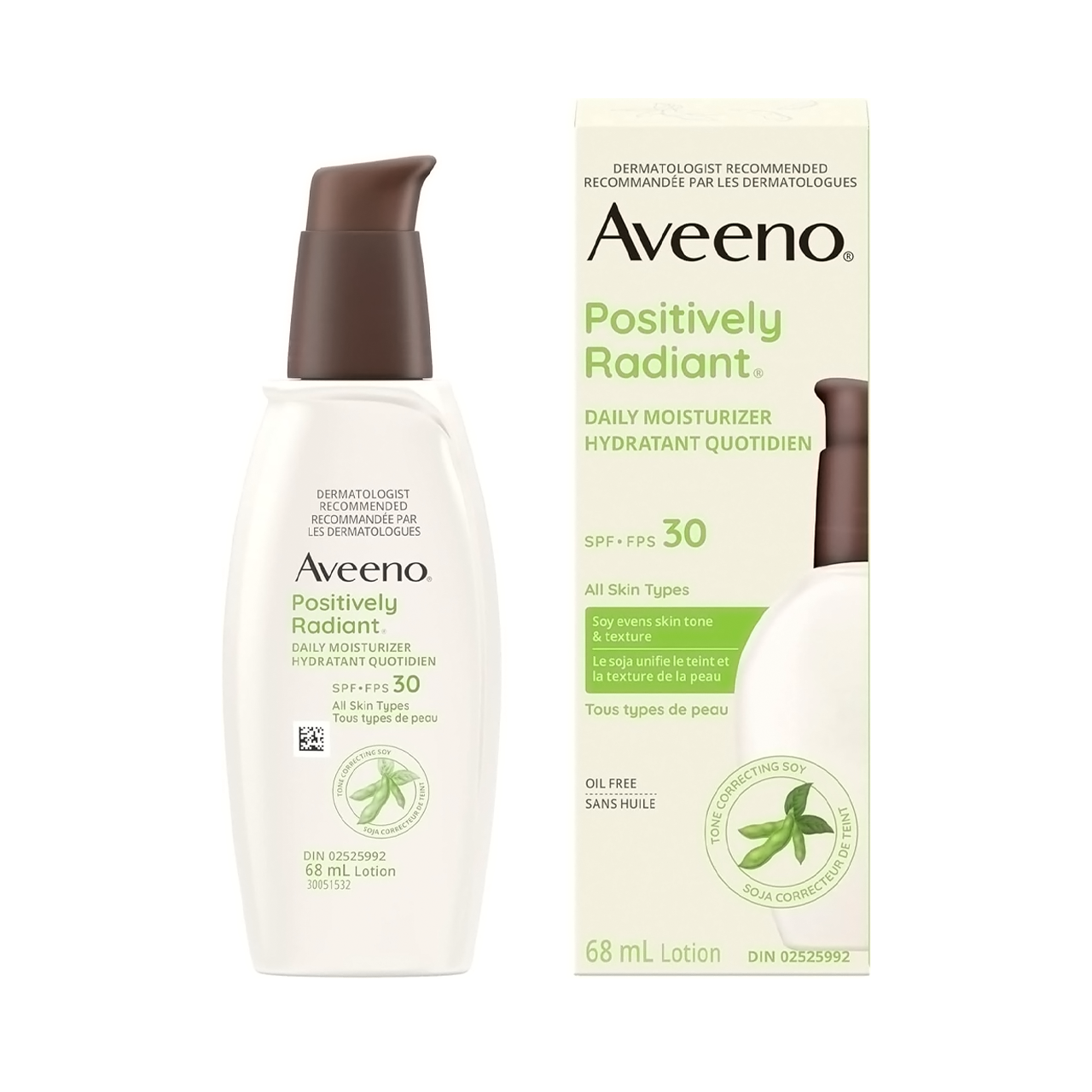Aveeno Positively Radiant Daily Moisturizer with SPF 30 lotion is suitable for all skin types. This face cream's formula is made with soy and SPF to improve signs of aging and protect against sun damage. This product comes in a 68 mL bottle of cream. Bottle now made with 30% Post Consumer Recycled Plastic.