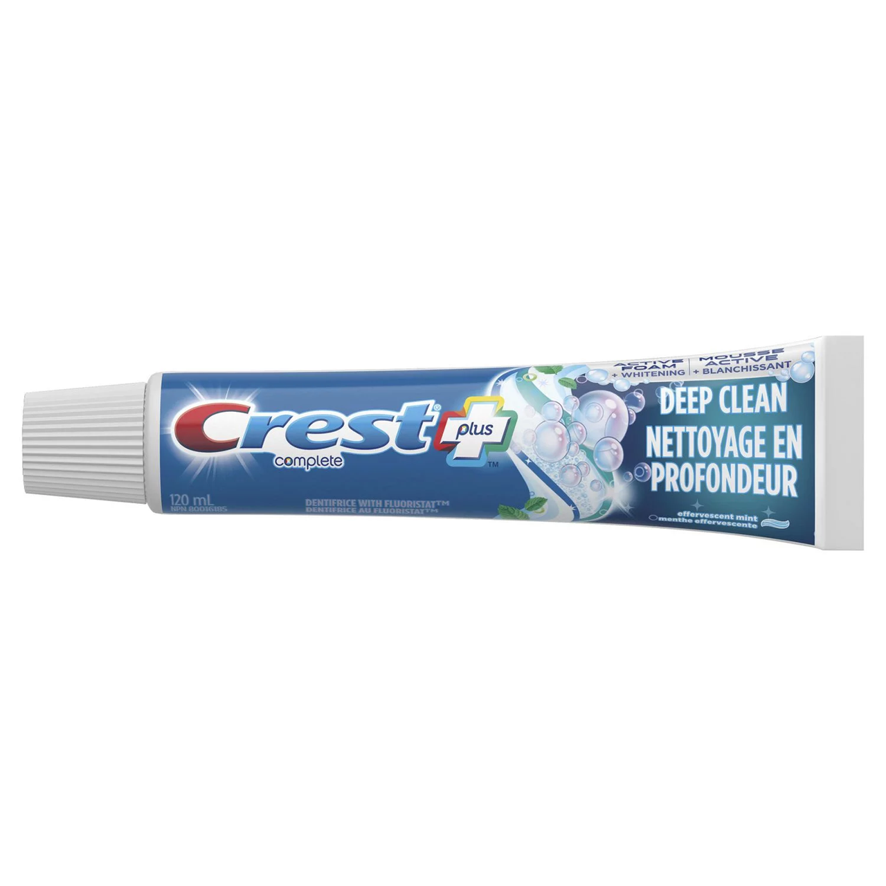 Crest Complete Whitening Plus Deep Clean Toothpaste provides up to 2x Deeper Clean feeling. The Improved Formula with Active Foam + Whitening helps fight cavities, tartar, and removes surface stains.