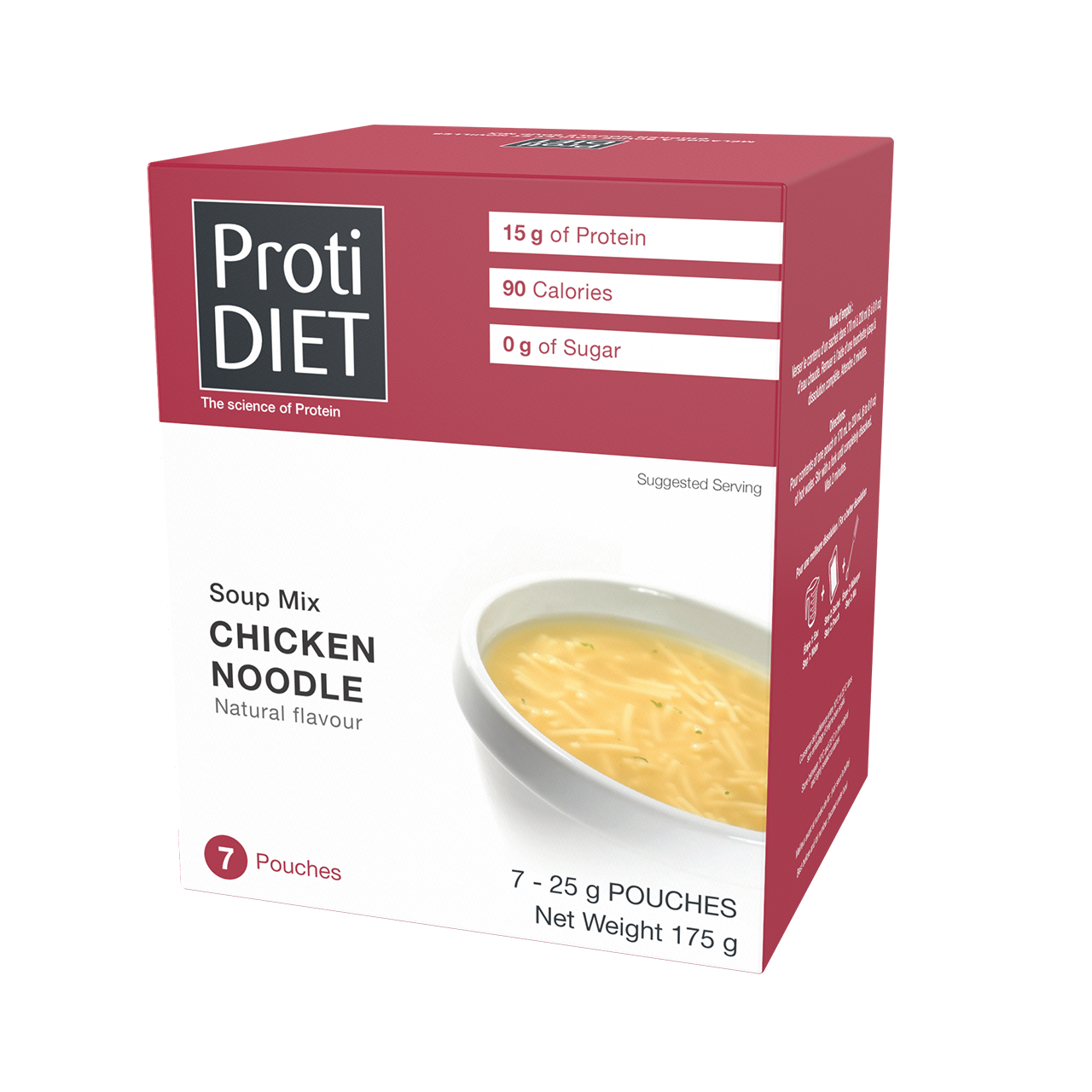For comfort and flavor look no further than ProtiDiet's Chicken Noodle Soup mix. Designed with your diet in mind, this high protein soup with egg noodles is as good a source of protein that can be used as it's own meal or as a great addition to your diet recipes for that added boost of flavor. It delivers 15 grams of protein in each low carb, fat-free 90-calorie serving. A steaming bowl of our Chicken Noodle Soup is sure to soothe the soul and satisfy hunger, all while helping you achieve your weight loss goals.